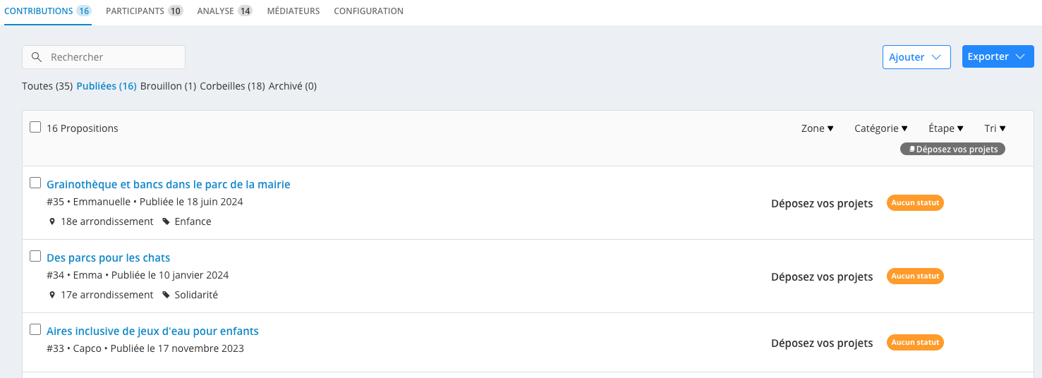 Pour cela, ouvrez votre projet participatif dans la rubrique Projets participatifs > Tous les projets et allez dans l'onglet Contributions.