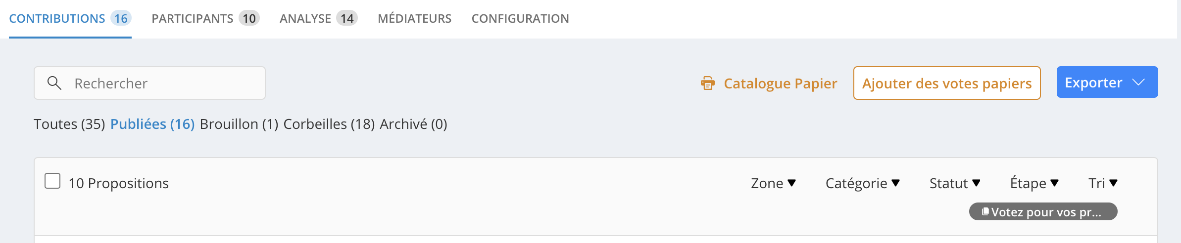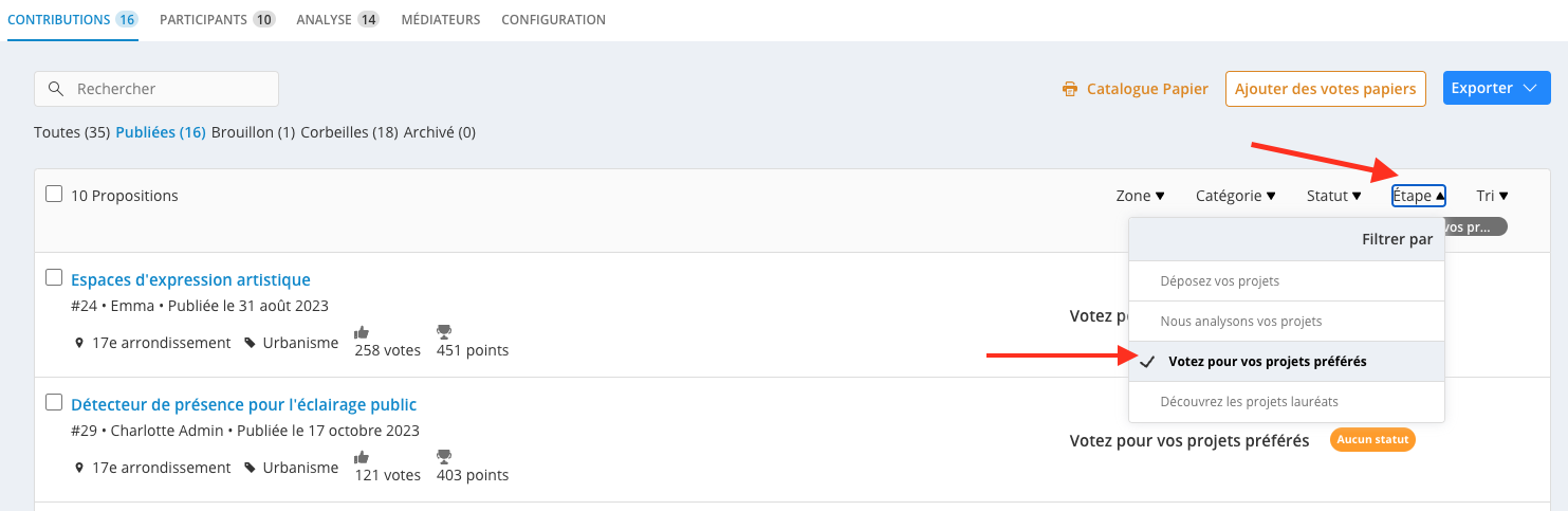 Lorsque vous sélectionnez le filtre Étapes, vous avez également accès à deux fonctionnalités liées au vote : le catalogue papier et l'ajout de votes papiers sur les propositions.