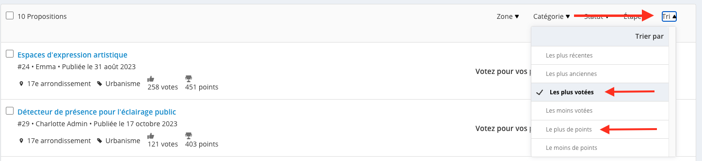 Seules les propositions soumises au vote sont affichées dans ce filtre. Sur chaque ligne de proposition, vous pouvez voir le nombre de votes ainsi que le nombre de points si vous avez activé le classement par points.